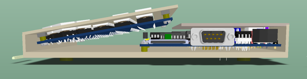 There is the additional problem of placing the main PCB with connectors on two edges, into the bottom PCB, I remember that on the C64 they handled this mechanical problem by having a separate plate that could be mounted over the switch and power and joystick ports, but that is a too complex solution.